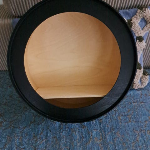 Kolmijalkainen pöytä jossa säilytystilaa kannen alla. Kantta voi käyttää myös tarjottimena.