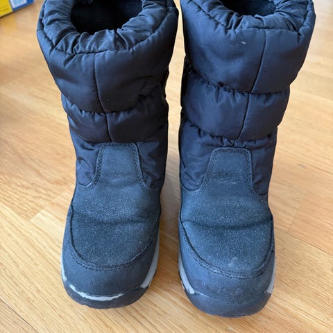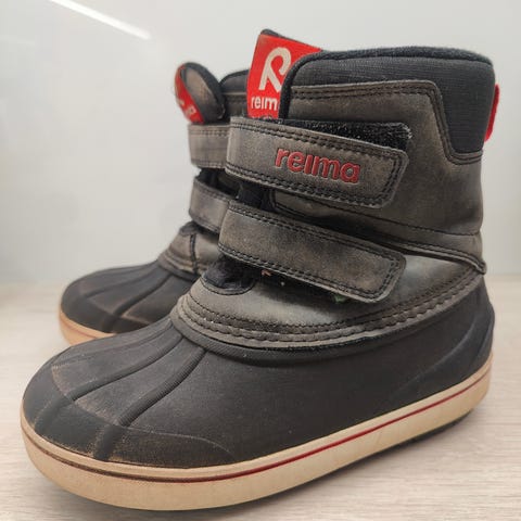 Hyväkuntoiset Reiman talvikengät. Etuosan merkki rispaantunut, mutta muuten täysin ehjät, tarrat pitää hyvin.