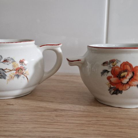 Arabia astiasto, joka sisältää kermakon ja sokerikon. Astiaston yksityiskohdat näkyvät kuvissa. Singapore piippuleima