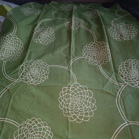 Myydään kaksi retroverhoa. L110cm, P155cm (+ käännösvara 13cm). Valkoisella pohjalla oliivinvihreitä ja sinapinkeltaisia kuvioita. Kreppikangas.