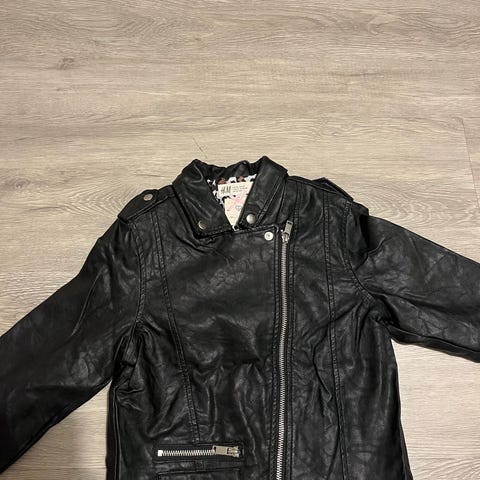 H&M lasten tekonahkainen takki mustassa värissä. Takki on unisex-mallinen ja lasten koko 140. Materiaalina on tekonahka.