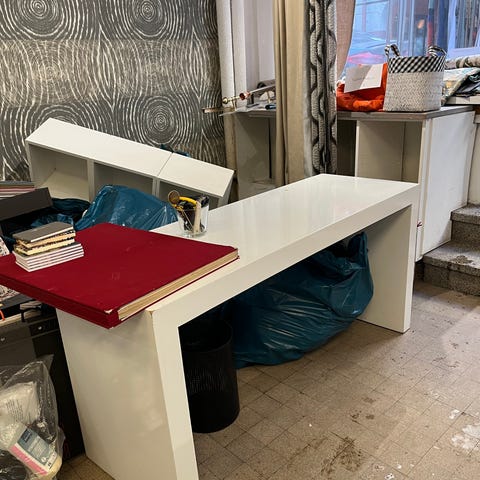 Varattu. Valkoinen säädettävä työpöytä kaasujousi säätö korjattavaksi