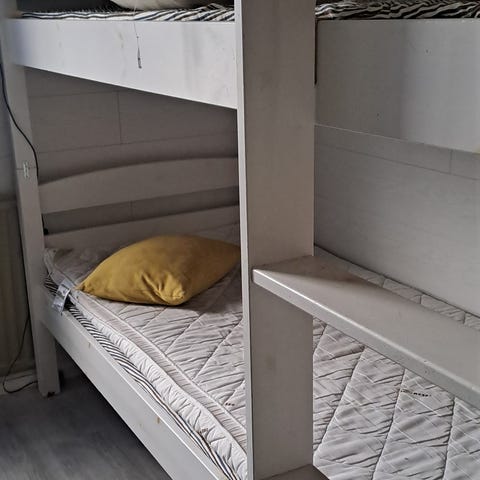 Metallinen kerrossänky. hyvä jämäkkä sänky. muutamia tarroja liimattu runkoon.