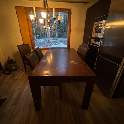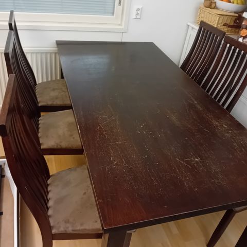 Pöytä ja tuolit on joskus maalattu edellisessä kodissa ja kokonaisuus on edelleen tukeva ja käyttökelpoinen – hyvä ruokailuryhmä vielä uuteen kotiin.