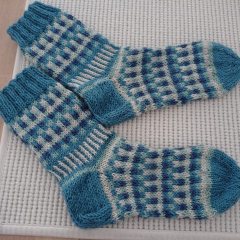 Villasukat, koko 39 - 41, pohjan pituus venyttämättä 25 cm, joustaa ja mukautuu jalan kokoon. Pitkä varsi kirjoneuletta kahdella langalla (lämmin), kantapää vahvistettua neulosta, teräosa yhdellä langalla, joten mahtuu hyvin kenkään. Pohkeessa hyvin tilaa.