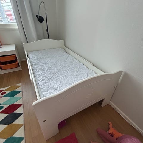 Jatkettava lastensänky, jossa valkoinen puinen runko ja puinen sälepohja. Sängyssä on päädyissä ja sivuilla laidat, jotka tuovat lisätukea ja rajaavat nukkumatilaa. Sopii lapselle, jolle halutaan pituudeltaan säädettävä sänky, jota voidaan jatkaa lapsen kasvaessa. Valkoinen väri ja puinen rakenne sopivat monenlaiseen lastenhuoneen sisustukseen.