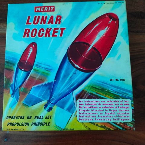 Moon rocket avaruusalus japanilaisen Modern toysin valmistama 60-luvulta. Pituus 23 cm. Paristokäyttöinen, mutta ei toimi. Katolla pitäisi olla seisomassa avaruusmies, se tästä puuttuu. Nouto.