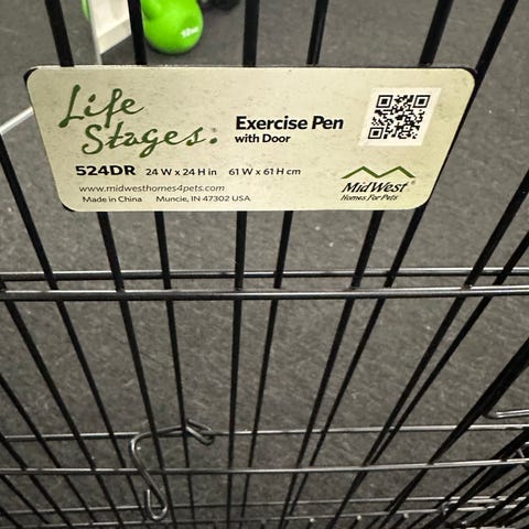 Life Stages Exercise Pen koirille sisältää oven. Musta päällystetty metalliverkko. Sopii koirien turvalliseen eristämiseen ja harjoitteluun. Meillä viritetty häkiksi irrottamalla kaksi elementtiä katoksi, ja kiinnittämällä ne nippusitein. Kaikki osat hyvässä kunnossa, mutta siis 6 + 2 osaa nykyään.