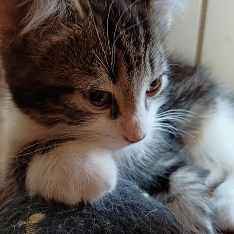 Synnyin sisarusteni kanssa 6.11.2025 ja täytän 14 viikkoa (luovutusikä) 13.2.2026. Sanovat minun olevan sini-bi, mitä se sitten tarkoittaakin. Olen reipas tutkimusmatkailija ja koirien kaveri, vaikka ne välillä yrittävätkin paimentaa. Olen silloin aivan ölvinä paikallani ja harhautan niitä. Kyllä ne sitten viimeistään lopettaa jos sanon niille, että antaa ny olla, mulla on muuta tekemistä. Opettelen käytöstapoja niin koirilta kuin toisilta kissoilta.