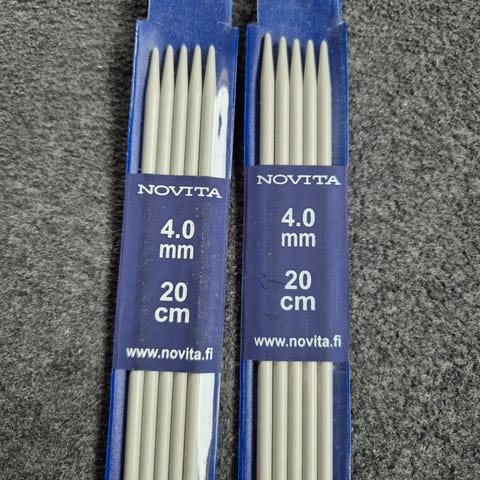 Novitan harmaat sukkapuikot koossa 3,5 mm. Paketissa on 5 puikkoa. Puikkojen pituus 20 cm. Materiaali alumiinia. Hyvässä kunnossa.