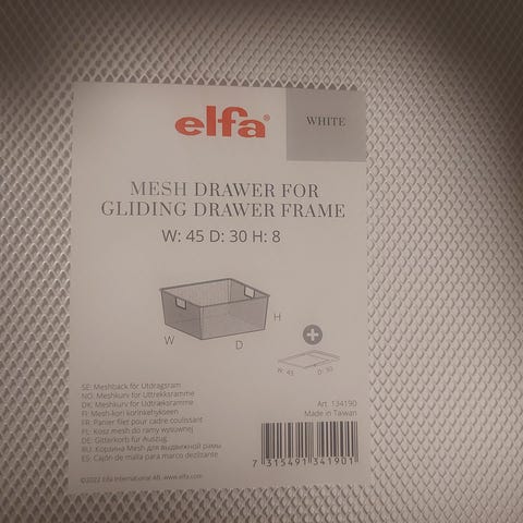 Elfan valkoinen, ulosvedettävä korinkehys, jonka mitat ovat 449x336x25 mm. Korinkehys sopii Elfan mesh- tai lankakoriin (moduulisyvyys 30).