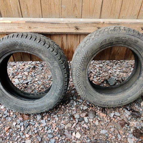 Kaksi renkat hybässä kunnossa ja kahdesta muusta renkaasta puuttuu osa nastoista, mutta kulutuspinta on syvä.