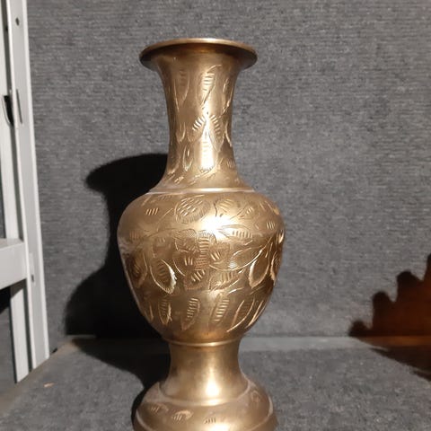 Tässä todellakin umpi messinkinen koristeltu iäkäs maljakko,esim ruusu säilyy uskomattoman kauan en tiedä miksi mutta viikkoja.messinki vaikuttaa ilmeisesti jotenkin! Vain 39