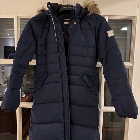 Tyttöjen untuvatakki, pituus polven kohdalle/vähän alle. Takki on väriltään hieman metallihohtoinen/burgundi/ruskea ja ihanan kevyt päällä. Kunto on mielestäni erittäin hyvä, käytetty vain ns. parempana takkina kauppareissuilla ym. Jäänyt pieneksi, ihana takki!