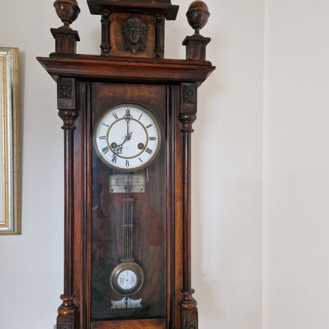 Seinäkello, jossa on puinen kehys ja kullanvärinen heiluri. Kello toimii avaimella vedettävällä mekanismilla. Kellon taulu on valkoinen mustilla numeroilla ja osoittimilla. ( tämä tekoälyn tuottama)