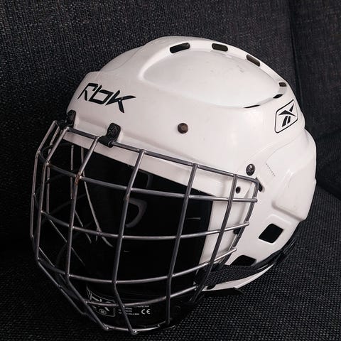 Reebok jääkiekkokypärä, väriltään valkoinen, varustettu metallisella kasvosuojalla, koko M. Mukana Jofa pienikokoinen kypärä, harmaa.