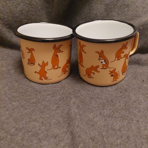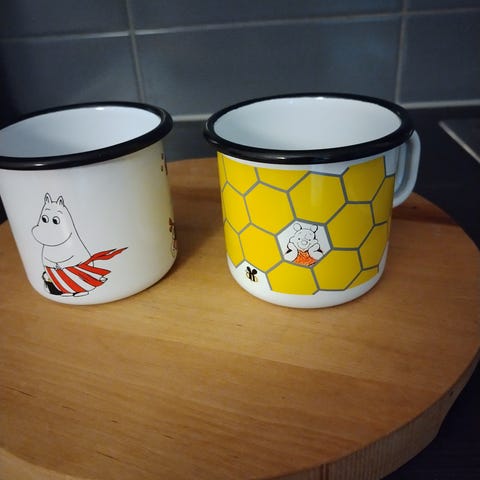 Pari kertaa käytetyt emalimukit. Vappu Pimiän suunnittelemaan astiasarjaa.