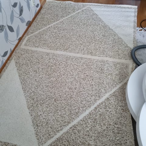 Vaaleanharmaa matto, kooltaan noin 160x230 cm. Maton materiaali ja tarkempi valmistaja eivät ole tiedossa. Matto soveltuu sisätilojen lattian peittämiseen ja sisustuselementiksi.