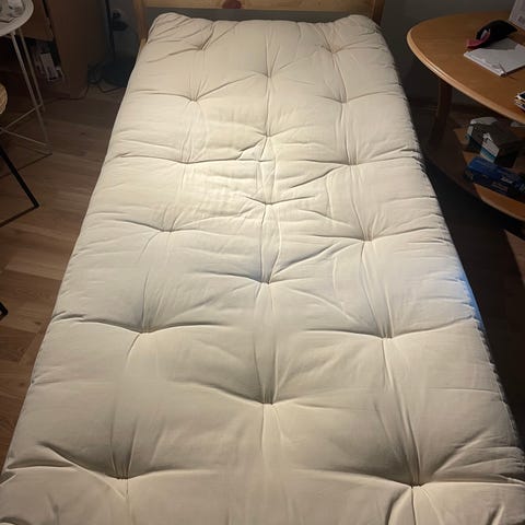 Myydään hyvässä kunnossa oleva Mulperipuun Cocos Futon patja. Patja on käytetty ja ajan myötä kovettunut (kuten futoneilla on tapana) joten jäykästä patjasta on kyse. Patjalla käytetty aina patjansuojusta nukkuessa. Yksi haalea tarha, katso viimeinen kuva. Päällikangas kaunis pellavan harmaa (väri 72).