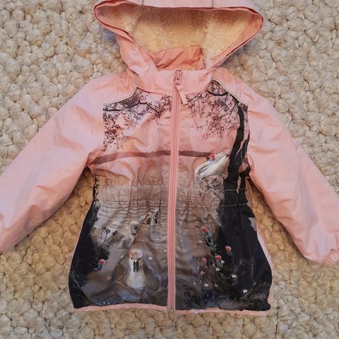 Aivan ihana kukallinen Me Too vk-takki koossa 86. Irrotettava huppu, hihoissa sisäresorit. Ohut kangasvuoraus, tulevaa päällinkangasta. Pitää sadetta ainakin jonkin verran, ei ole kokeiltu pitävyyttä kaatosateessa.