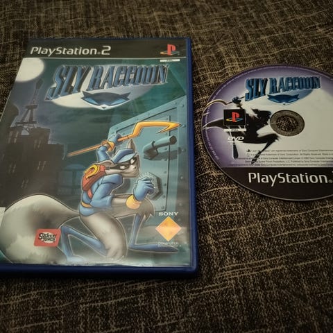 Sly Raccoon PlayStation 2 -konsolille. Ohjekirjan yhdessä aukeamassa repeämä ja irronnut toisesta niitistä. Toimivuus testattu 10 minuutin pelaamisella.