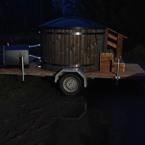 Peräkärry palju pyörillä, musta väri. Kiramin Palju noin 12.v vanha lämpökäsiteltypuu on varustettu portailla ja savupiipulla. Sisätilassa on puinen istuinalue ja kamina merialumiinia.