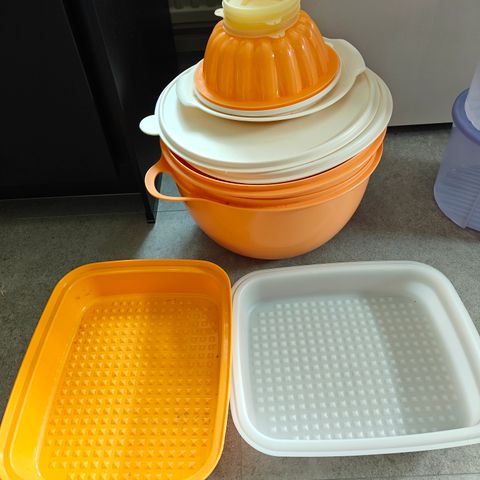 Uusi Tupperware 1,5 litran oranssi Minimax "haitarikulho' ja käyttämättömät vihreät Elegance salaattiottimet yhteishintaan