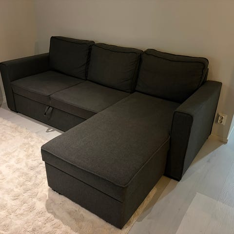 Divaanisohva. Aikanaan Vekestä ostettu, palvellut monta vuotta ja palvelee varmasti vieläkin monia vuosia eteenpäin. Divaaniosan jousia päässyt ajansaatossa irti, taitava osaa keksiä keinon ja laittaa jouset takaisin paikalleen. Jämäkkä istua. Selkätyynyt irtonaiset ja irroitettavat päälliset, istuintyynyt kiinteät. Tahrat lähtevät helposti pyyhkimällä, eikä jää laikkuja kankaaseen. Kankaat ehjät kauttaaltaan.