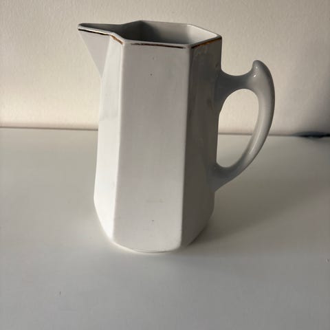 Arabian söötti maitokannu. Korkeus 12cm. Reunan kultaus on kulahtanut ja pohjassa lasitteessa pieni mikrohalkeama. Kuitenkin ehkä ja siisti.