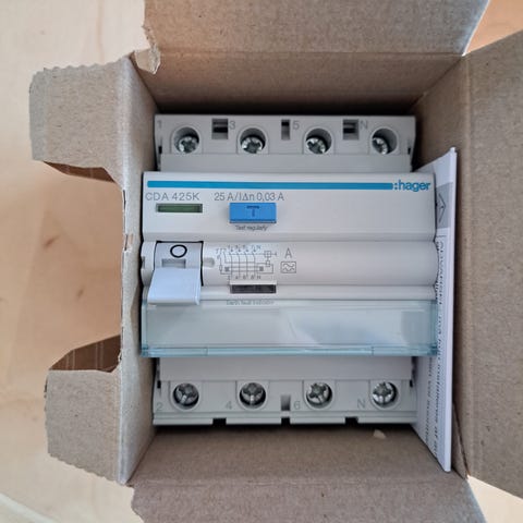 Käyttämätön Hager CDA225K vikavirtasuojakytkin, 2-napainen, nimellisvirta 25 A, vikavirtasuoja 30 mA.