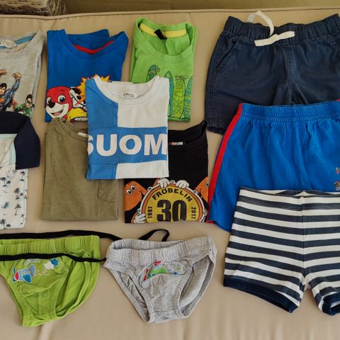 Myydään kuvassa näkyvät vaatteet.( shortseja caprilegginssejä, paitoja, t-paitoja sukkahousuja jne) Vaatteet ovat ehjiä mutta jotain pieniä tahroja voi olla ja osassa on pesunukkaa. Tupakoimaton ja eläimetön talous.