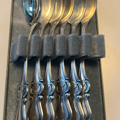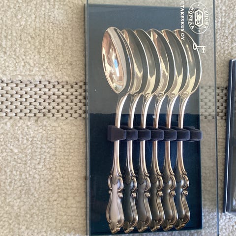 Myydään uudet Romantiikka-sarjan kahvilusikat 12 kpl, salaattiottimet ja kakkuottimet alkuperäisissä laatikoissaan. Lahjaksi saatu jouluna 2025. Ei kaiverruksia. Romantiikka-sarja on suunniteltu Kultakeskuksessa jo 1970-luvun alussa. Klassinen ja tyylikäs ruokailuvälinesarja. Kahvilusikat 12 kpl 520 e (ovh 984 e)