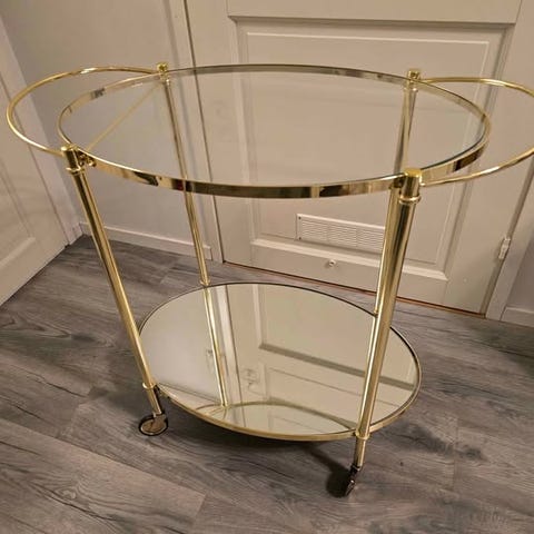 Erinomaisessa kunnossa oleva kaunis tarjoiluvaunu. Molemmat tasot voi nostaa irti ja käyttää tarjottimina. Valkoiset osat ovat metallia ja kahva eukalyptuspuuta. Renkaissa on kumireuna.