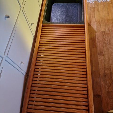 Sorvattu, lakattu, tukeva kukkapöytä. Vain nouto. Kukkataso n. 19 cm.