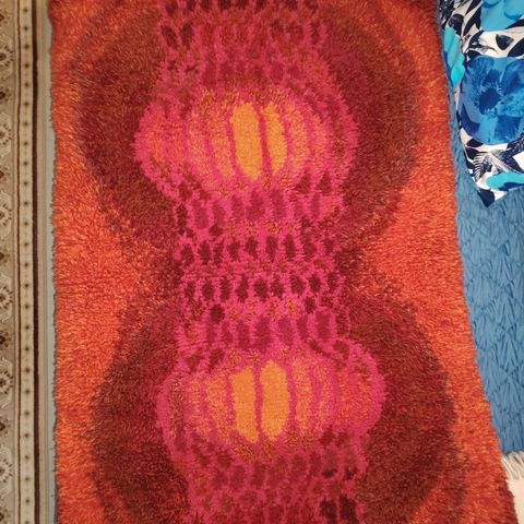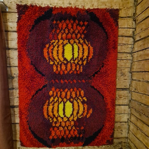 Terttu Tomeron palkittu Katiska-ryijy harvinaisessa punaisessa värissä. Ryijyn nukat priimakunnossa.