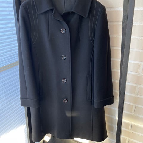 Musta siisti villakangas takki vähän käytetty koko 38, halkio helmassa.