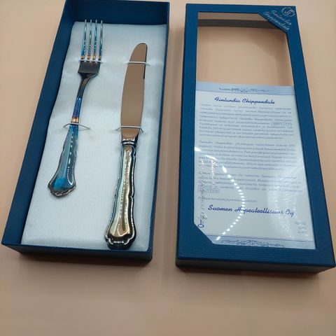 Hienokuntoinen, käyttämätön veitsi hopeinen varsi ja terä ruostumaton teräs pituus 18,5cm paino 87g hopean leimat r9=1994 ei henk. kaiverruksia. Veitsi saattanut liikkua säilytyksessä, jotain voi näkyä tarkkaan tutkiessa, laatikko kulunut ei alkuperäinen. Katso Chippendale jälkiruokalusikat eri ilmoitus.