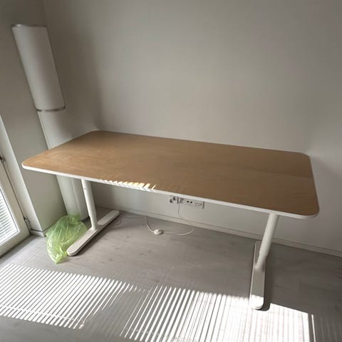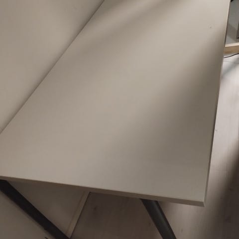Suuri työpöytä, joka pinnaltaan melamiinia tms. Pöydän koko suunnilleen 80x 160 ja korkeus on säädettävissä n. 73 cm ja 63 cm välillä. Pöydän alla on metallikehikko, johon jalat on kiinnitetty. Jalat muuten metallia, mutta säädettävä alaosa sekä säätöosan suojukset muovia. Tästä hyvä ja tukeva pöytä seuraavalle käyttäjälle tilanpuutteen vuoksi. Kannettu meille kokonaisena kaupasta, joten jalkoja ei ehkä kannata ruveta irrottamaan. Pöytä on jonkin verran painava. Nouto ok-talosta, joten ei tarvitse kantaa portaissa. Pöydässä on käyttökulumaa, koloa ja jälkeä, joista yritin ottaa kuvia. Hae edullisesti pois!