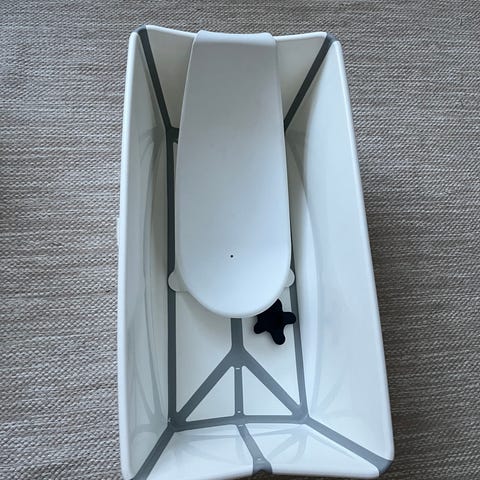 Myydään Stokken litteäksi taitettava kylpyamme jaloilla sekä vastasyntyneille tarkoitettu istuinosa, joka helpottaa kylvettämistä. Pohjassa on pieniä kosmeettisia jälkiä ja pieniä tummia pisteitä (näkyvät viimeisessä kuvassa), eivätkä ne vaikuta käyttöön.
