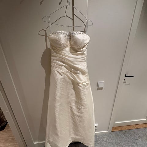 Myydään Bianco Eventon A-linjainen hääpuku koossa 36/S. Yläosaa on hieman alkuperäisestä vielä kavennettu. Pituus itselle (167 cm) oli 6 cm koroilla sopiva. Mekko on moitteettomassa, pesulassa pesetetyssä kunnossa poislukien vasemman kainalon pitsi, kaksi viimeistä kuvaa siitä. Mekon kokeilijalla siihen siis tullut reilu sormenpään kokoinen reikä. Tämä reilusti huomioitu hinnassa, varmasti korjattavissa.