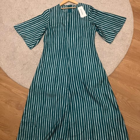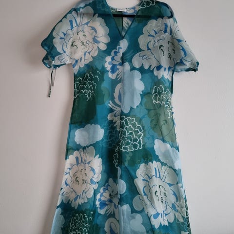Marimekon kaunis ja näyttävä ujeltaa piccolo 100% silkkimekko. Kepeä, kauniisti laskeutuva ja ylellinen silkki. Lyhyet hihat, ihana piccolo kuosi, piilovetoketju takana, alaspäin levenevä malli ja ihana istuvuus. Koko 42. Kai-kai 51cm, olka-helma 122cm. Edessä keskisauma aavistuksen löystynyt pieneltä matkalta ja säilytyksestä rypyssä, muuten erinomainen kunto.