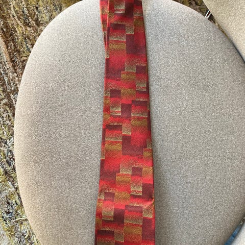 Marja Kurki miesten silkkisolmio, jossa on punainen ja sininen kuviointi. Valmistettu silkistä, tarkoitettu miehille. Koko pituus 140 cm. Levein kohta 9.5 cm. Hinta 8 euroa