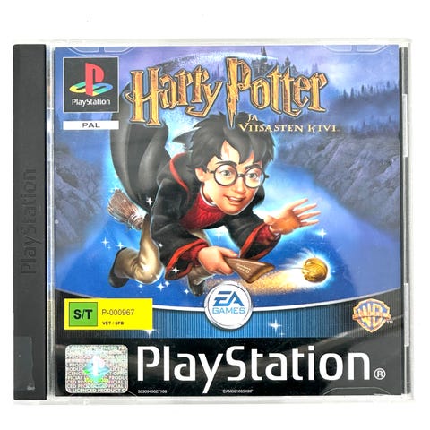 Harry Potter ja Viisasten kivi PlayStation 1-konsolille. Kotelo kulunut, naarmuinen, liimajäämiä, levyn pidike vahingoittunut. Kansilehti puuttuu. Levy naarmuinen. Toimivuus testattu PS3-konsolilla 10 minuutin pelaamisella. Pelissä suomen, ruotsin ja norjan kieli. Ohjekirja suomeksi.