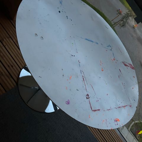 Pyöreä tuleva ruokapöytä. Pöytälevy on kulunut mutta jalat ovat hienossa kunnossa
