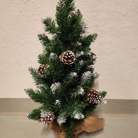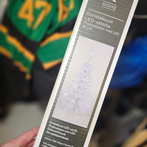 Mini joulukuusi, jossa patterit ja koristeet valmiina.