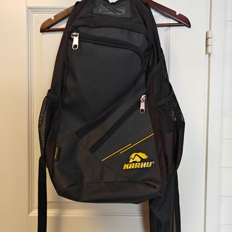 Musta Karhun pesäpalloreppu. Mailapussissa tyypillinen reikä, joka nyt paikattu ilmastointiteipillä. Halutessaan voi ommella siistimmin. Muuten hyvässä kunnossa.
