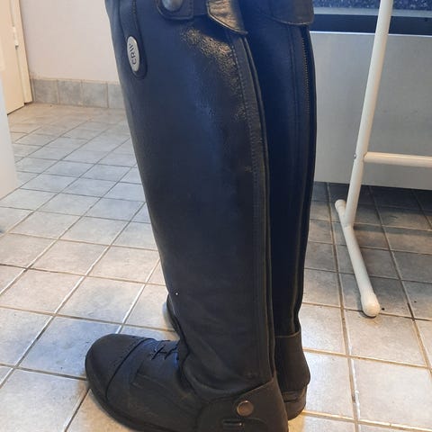 Mustat ratsastussaappaat, valmistettu nahasta. Saappaissa on vetoketju takana ja solki sivulla. Soveltuvat ratsastukseen ja muuhun käyttöön.