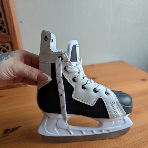 Valkoiset luistimet söpöllä karvareunuksella. Meille ostettu käytettynä ja muutamia kertoja luisteltu. Pinnasta huomaa käytön jäljen, mutta pääasiat ovat kunnossa: eli ehjät ja toimivat ovat. Sisämitta 18cm.
