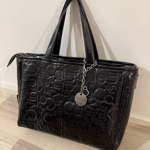 Calvin Klein musta iso käsilaukku, jossa myös olkahihna ja pehmustettu tietokoneosa läppärille vetoketjulla.