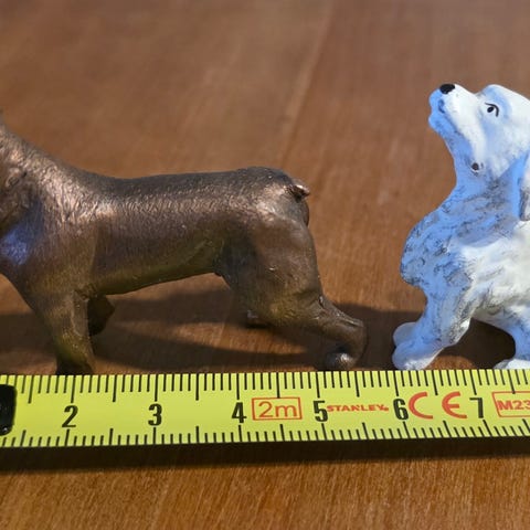 Pieni koristefiguuri, jossa on koira, joka makaa kivellä ja juo nestettä sinisestä letkusta tynnyristä. Figuuri on maalattu ja asetettu vihreälle alustalle, jossa on kiviä ja kukkia.
